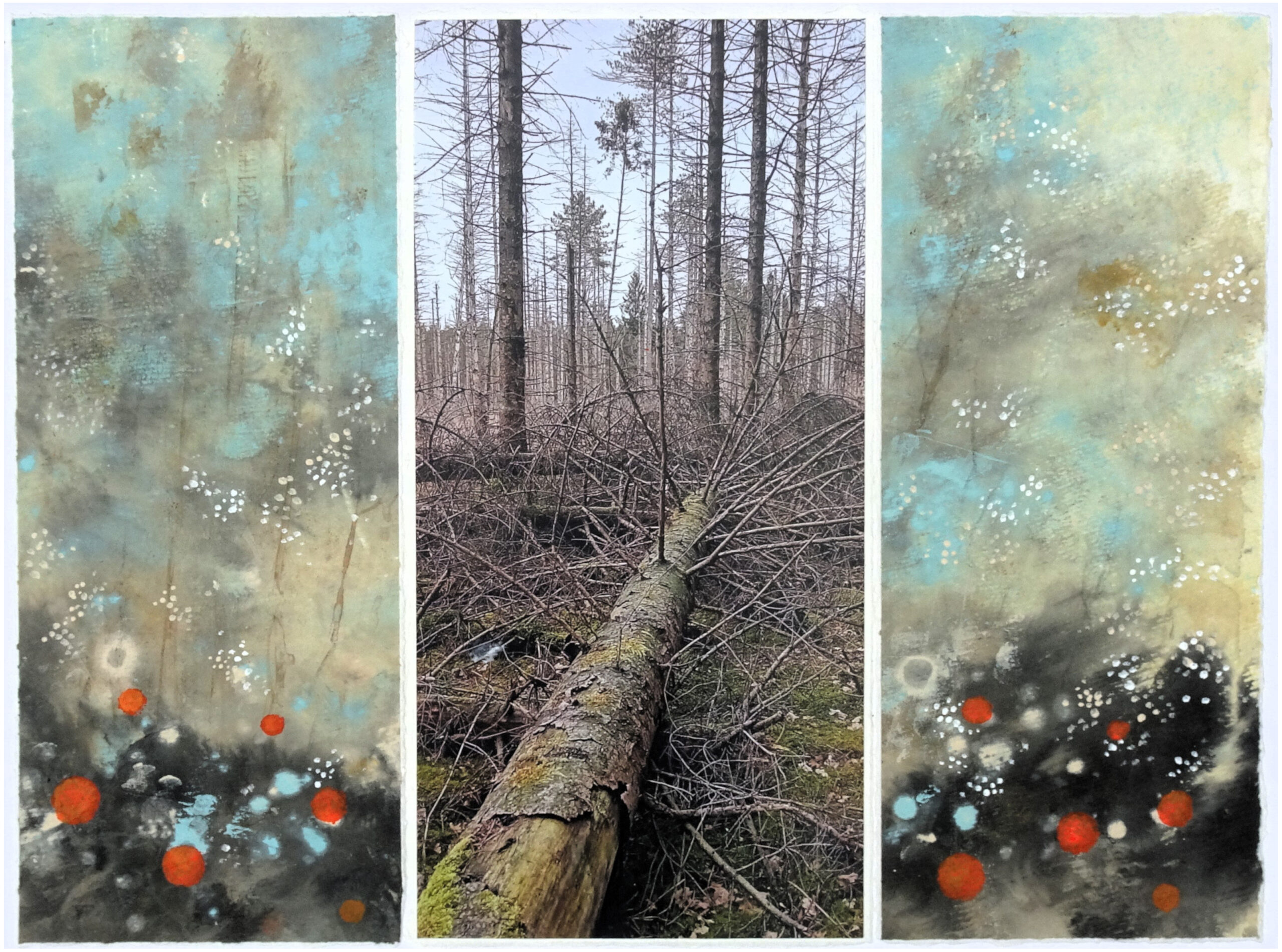 Ik fietste laatst ergens tussen Doldersum en Diever, een bospad door een stuk bos of wat daar van over was. Dode dennen staken nog af tegen de blauwe lucht en het was op de grond een chaos van dode bomen en takken. Het was het beeld wat je verwacht na een kernramp of een oorlog. Staatbosbeheer was aan het werk geweest stompen van omgehakte bomen stonden nog overeind. Het gevolg van de verzuring van de grond door stikstof, het lijkt wel een voorbode van wat ons te wachten staat als we door gaan het milieu niet serieus te nemen. Enigszins verbijsterd door het beeld van dat dode bos, maak ik wat foto’s en een ervan kies ik uit voor deze collage. Het wordt een soort drieluikje, de “zijpanelen” zijn van katoenpapier beplakt met bewerkt rijstpapier, met thee, acryl en potlood. En in het centrum de foto met de gevelde den, die mooi diepte geeft. In het bos zie je vaak bomen met rode stippen, die gaan eraan en worden gekapt. Die rode stippen heb ik verwerkt in de zijpanelen. Ik ben een optimistisch mens en denk altijd de natuur is sterker dan wij mensen. De eerste krentenboompjes staan al weer in bloei ze kondigen het voorjaar aan. Dood hout vergaat en zorgt voor nieuw leven, de cyclus van de natuur waar we ons uiteindelijk bij neer moeten leggen, gelukkig maar.