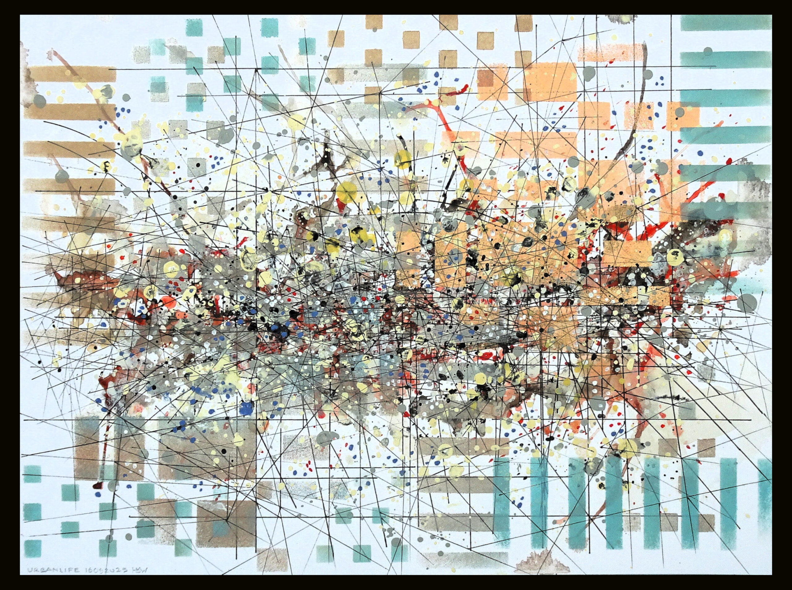 De drukte van de stad ergens waar weet ik niet, alles krioelt door elkaar, te veel te groot te luidruchtig. Ik zou er niet kunnen leven en wonen, geef mij de rust en ruimte van een dorp op het platteland. Ik hoor het geraas van auto’s mensen druk op weg naar het werk, geen tijd om naar elkaar om te zien het jachtige leven van de stadsmens. Dat is zo ongeveer wat ik hier heb weer willen geven. Met sjabloon heb ik wat vlakken gemaakt als achtergrond, met wat gespetter van dun lopende acryl verf het patroon van druppels geheel willekeurig. Net als Jackson Pollock met zijn drip techniek, het is nog moeilijk om dat te sturen en het niet een grote vlek wordt. Als je inzoomt zie je dat het ook nog dat het een heel palet aan kleuren is. Dan nog met fineliner talloze streepjes zetten die de dynamiek van de stad weer moeten geven. Waar stop je met het zetten van streepjes en laten vallen van druppels op het papier, wanneer het af is, maar het is nooit af het stadsleven valt nooit stil. Ik ga een stukje wandelen op de hei om de rust te vinden.