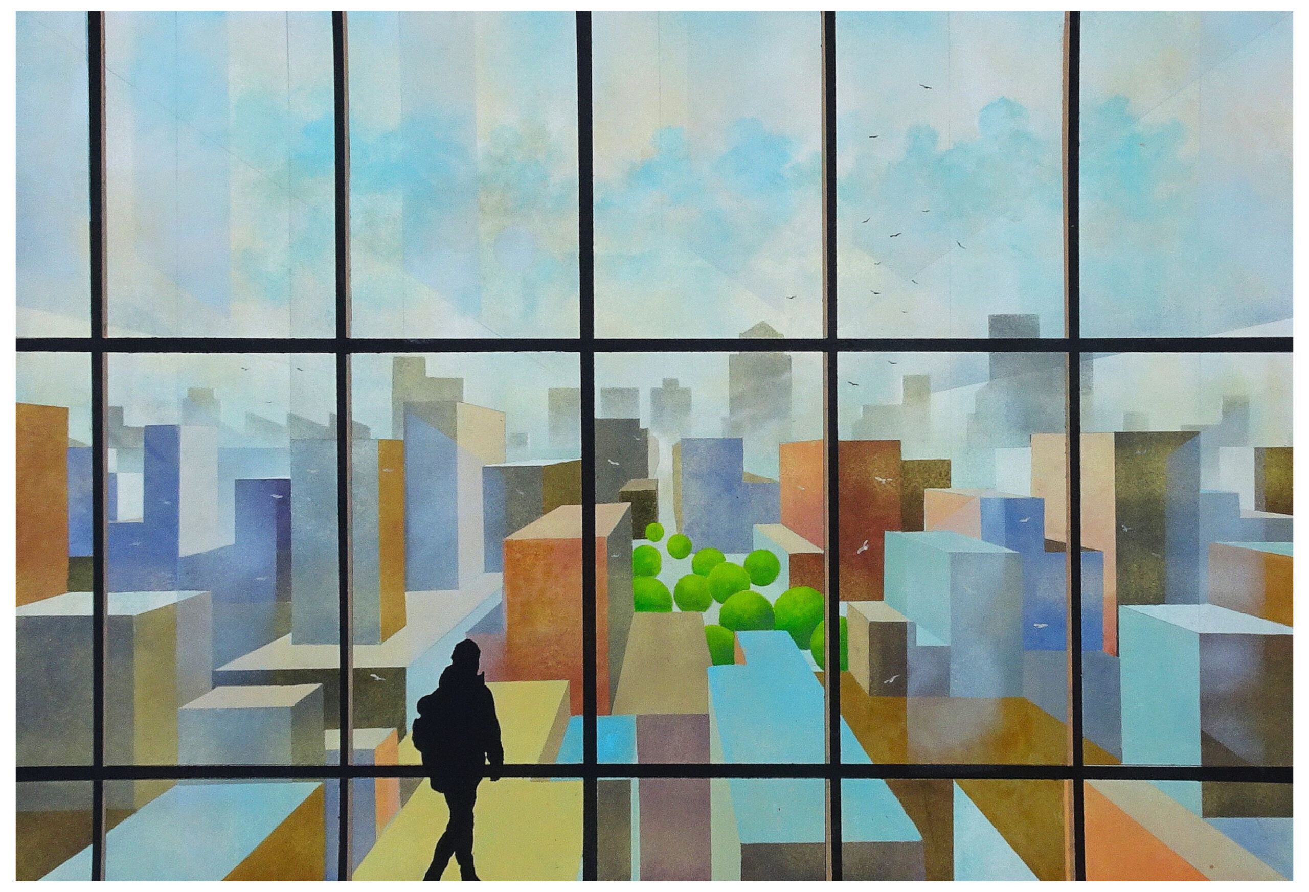 Dat slaat natuurlijk op het perspectief dat je als een vogel zicht hebt op de skyline van een stad. En voor de wandelaar en wij als kijker zien we de stad vanachter een raam ergens hoog boven een denkbeeldige stad. Ik heb dat beeld een keer gezien in Ã…rhus in Denemarken op de bovenverdieping van het Aros museum heb je een prachtig panorama over de stad. Die ramen waren ook nog in gekleurd glas dus dat gaf een extra dimensie. Ik heb met een centraal perspectief de huizen geconstrueerd en ingeschilderd, hier en daar kun je de potloodlijnen nog zien. Ik heb geen mensen of ramen in de huizen aangebracht , ik ben een luie schilder, alleen als je goed kijkt zie je vogels boven deze verzonnen stad. Zo vrij als een vogel, zo voel ik me als ik dit aan het maken ben, voor de illusie houd ik me wel aan de regels van het perspectief maar voor de rest is het mijn fantasie. Kost een paar uur maar dan heb je ook een hele stad aan je voeten liggen en wandel je zo het schilderij in.