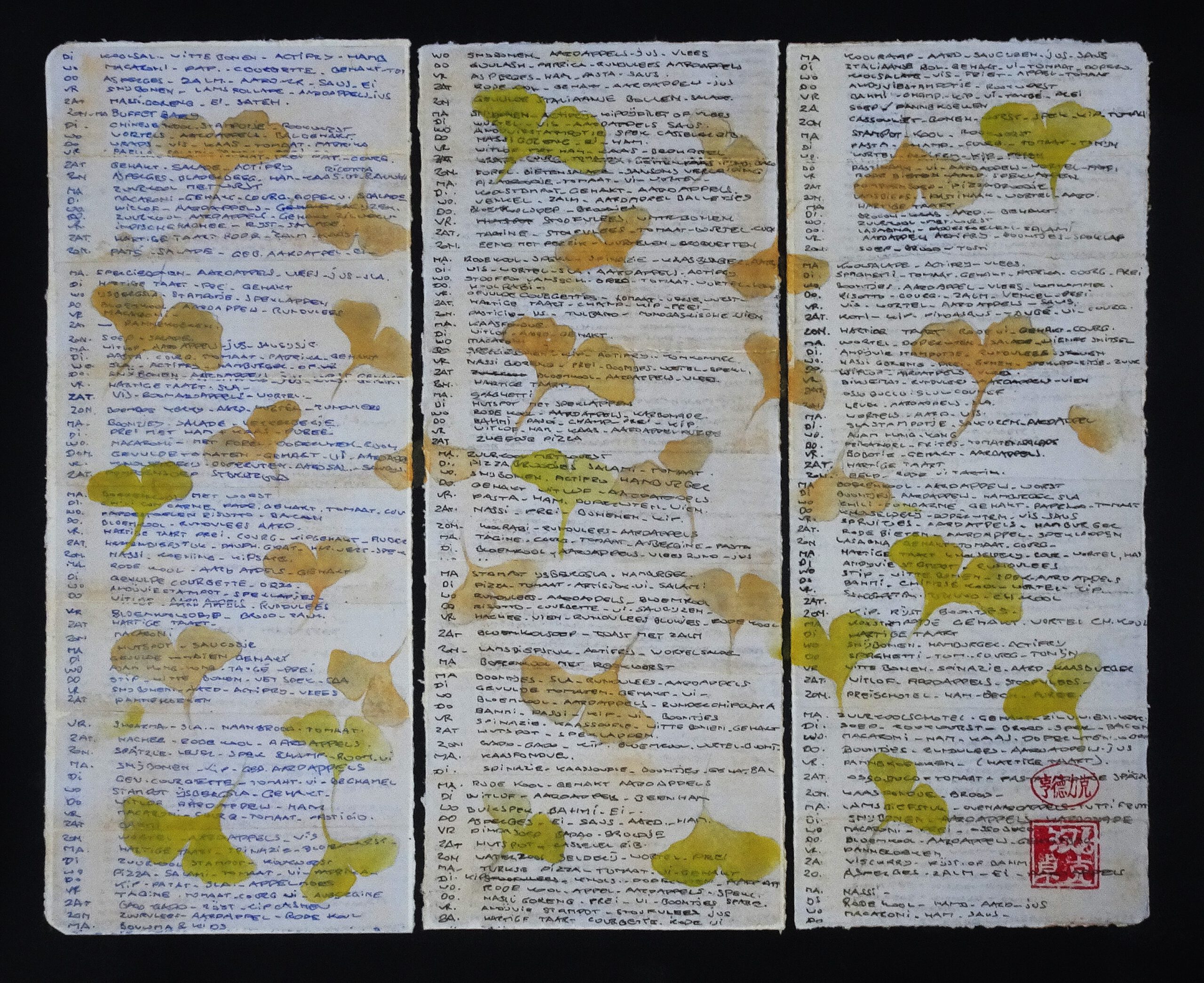 Een atypisch kunstwerk geïnspireerd op de Chinese kaligrafie, reeksen voor mij onbegrijpelijke karakters hebben mij altijd gefascineerd. Ik was gewend vroeger in een notitieboekje een weekmenu te maken, dan hadden we een houvast voor de inkopen die we door de week moesten doen. Ik bladerde dat boekje weer eens door en zag in het ritme van de tekst een soort kaligrafie. Ik heb de bladzijden uit het boekje gehaald en ze afzonderlijk gelakt en de bladen op stroken katoen papier geplakt. Die heb ik weer op een zwarte ondergrond gelijmd. Met een sjabloon heb ik bladeren van de ginkgo boom erover heen gezet. De boom is al heel oud en staat voor een lang leven in de Aziatische filosofie. Tenslotte heb ik mijn Chinese handtekening gezet met een paar rode stempel afdrukken, om het idee van de Chinese kalligrafie te benadrukken. Of het kunst is weet ik niet, het gaat om het idee, ingelijst heeft het wel iets van de menukaart van een chinees restaurant. In China staan er gelukkig foto’s bij dan kun je ongeveer nagaan wat de pot schaft. Hier is het overigens de Hollands pot, maar daar ging het mij niet om. Het beeld en ritme van de tekstregels was de inspiratie om dit te maken en kaligrafie is in China een kunst op zich.