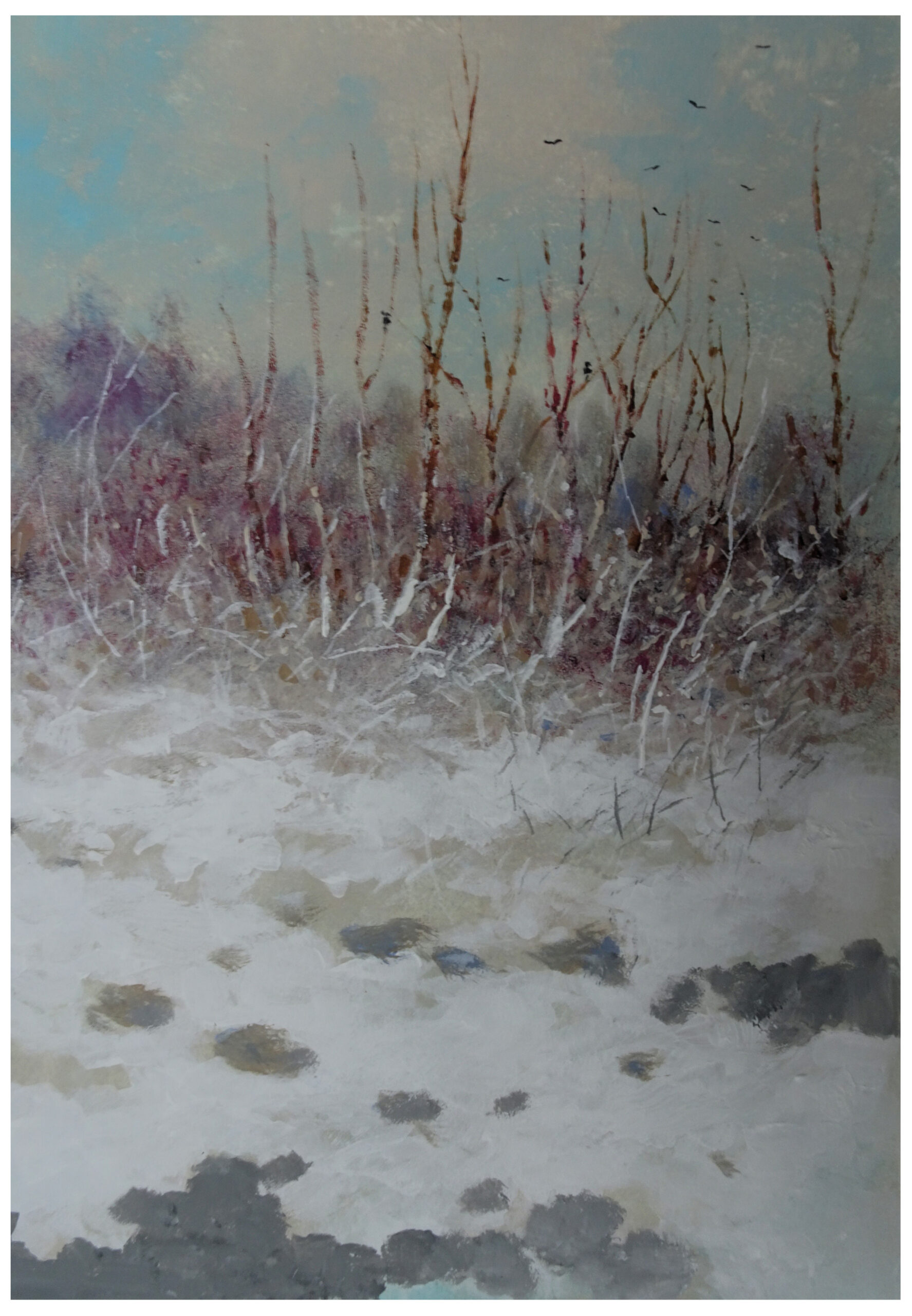 De afgelopen winterse periode zorgt voor de nodige inspiratie, even kijken of het nog lukt om de indrukken van de winter en de sneeuw vast te leggen. Onderwerpen genoeg, ik kies voor een stukje bos met wat sporen in de sneeuw. Je ziet ze wel vaker zo’n rijtje dode bomen in  het riet, ze staan met de voeten in het water en daar kunnen ze niet tegen. Een beetje nevelige atmosfeer, wat kraaien cirkelen rond in de verte, verder niet veel te beleven. Toch als je goed kijkt krijgen de doorgaans wat eentonige takken en het riet door de sneeuw een mooi rafelrandje. Dat levert een romantische sfeer op een kerstkaart zo je wil, ik heb me er een uurtje mee vermaakt. Kunst nou dat hoeft niet, gewoon plezier in het schilderen een schetsboekblad met  wat verf meer is niet nodig. Ik zie ze nog wel eens liggen in een museum, schetsboekjes van een kunstenaar, ik ben er gek op ze zijn voor mij de ziel van de schilder.