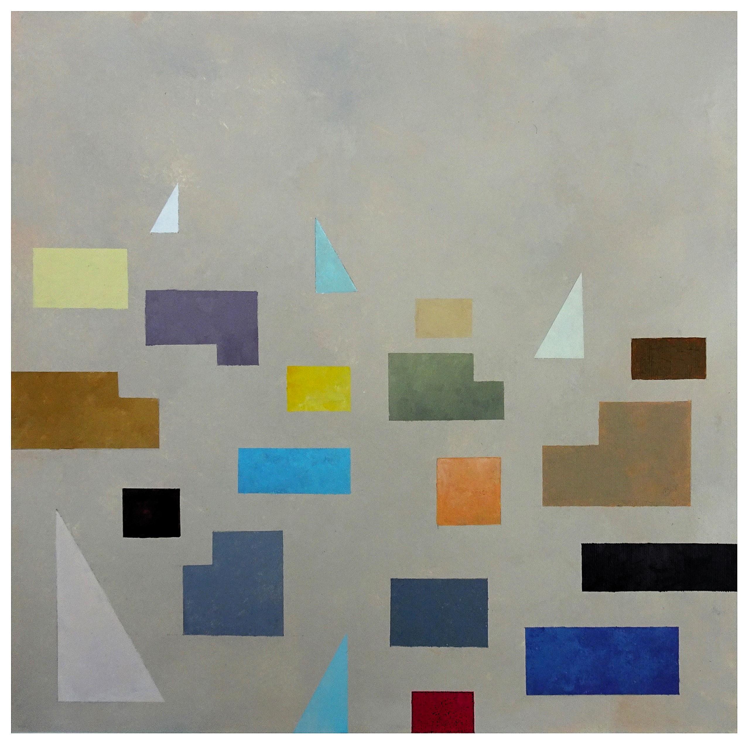 Ik heb dit werk vorig jaar oktober na de zomer geschilderd. Maar nu de zomertijd weer is ingegaan past dit wel, om ons te weer verheugen op de komende zomer. De zonnige dagen, het warme licht van de avondzon. De nevelige atmosfeer van een vroege morgen in de Weerribben. Daarbij past niet de “hardheid” van een collage, vandaar de uitgebalanceerde wat tere kleuren van dit werk. Ik heb een neutrale achtergrond geschilderd met daarop gekleurde vlakken. Ik heb een schets gemaakt voor de verdeling, met een collage kun je nog makkelijk schuiven. Maar hier kun je niks aan het toeval overlaten. De kleuren kun je nog wel aanpassen maar de positie staat vast. Dat kost tijd en aandacht voor een evenwichtige compositie. Je kunt er van alles in zien, of niet natuurlijk. Het is net als met een ouderwetse blokkendoos je kan er alles van maken. De driehoekjes maken het wat makkelijker, je kunt de zeilboten zien dobberen op een Fries meer in de warme bries van een late namiddag. Ik heb er met plezier een paar dagen aan gewerkt. En geniet alvast van het “voorafje” de lente ook een mooi onderwerp voor een kunstwerk.